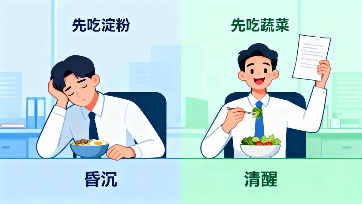 先吃蔬菜與蛋白質,不僅對血糖友好,對整天的精神狀態也很有幫助。很多人吃飽午飯後會昏昏欲睡,這是因為大量碳水化合物讓血糖快速飆升又驟降,導致腦部能量不穩。改用逆序吃法,能讓血糖緩緩上升,維持專注力與工作效率。